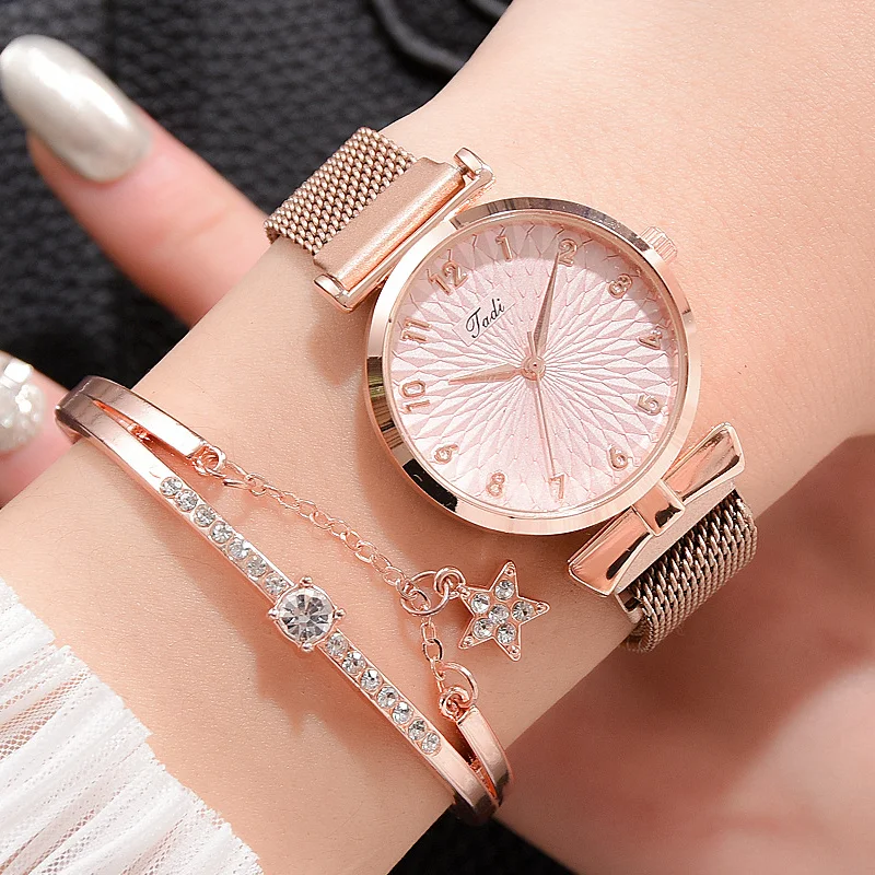 Relojes de mujerArtículo caliente Conjunto de relojes de lujo para mujer, relojes de pulsera femeninos elegantes, banda de malla magnética, relojes de pulsera de color rosa para mujer Erb1emJZXyk