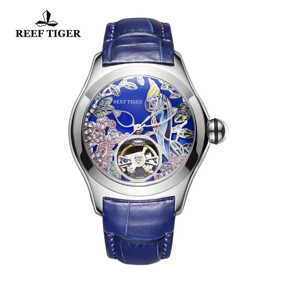 Name: Reef Tiger-relojes de lujo para mujer, correa de cuero azul, relojes mecánicos analógicos de acero, deportivos, RGA7105